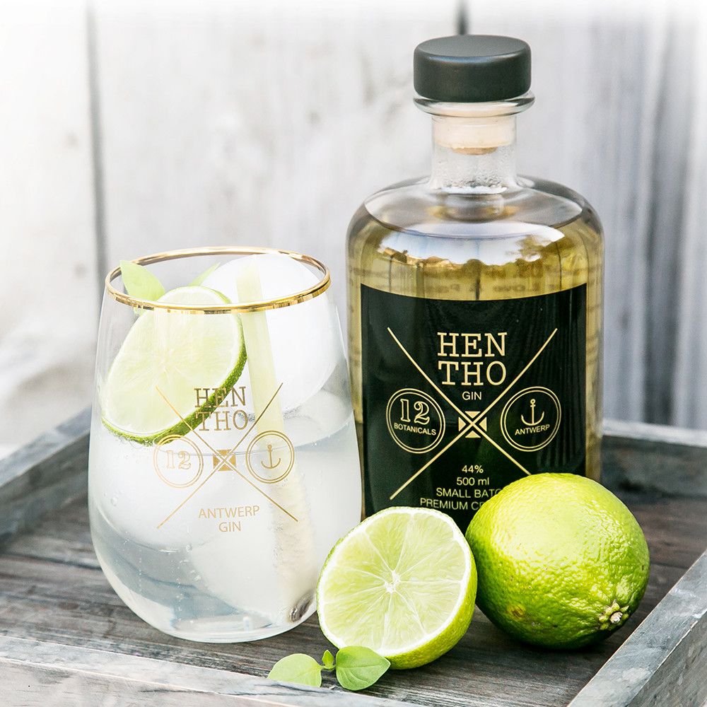 HENdrik & THOmas maken in hun micro-distilleerderij in Antwerpen deze HENTHO small batch gin met 12 botanicals waar kardemon, angelica, kefir limoenblaadjes, limoengras en zwarte peper de hoofdrol spelen.